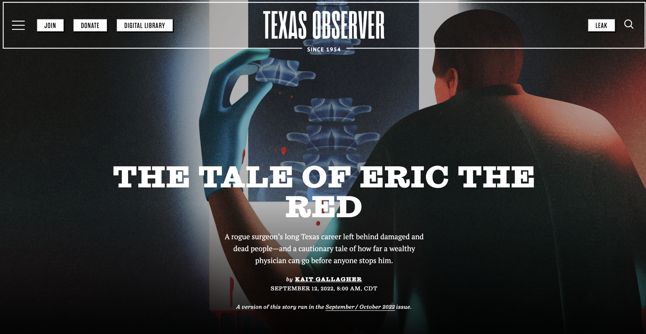 I wrote the feature article Rogue Surgeon: the Tale of Eric the Red for Texas Observer in 2022. The article was listed as a top-ten story that year and 2022 must-read for the magazine. You can read it here.